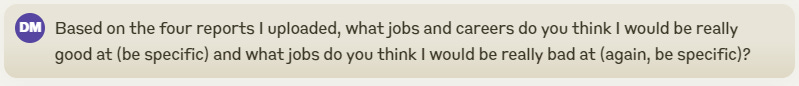 I uploaded 5 assessments: Hogan Flash Report (HPI, HDS, MVPI), Birkman Signature Report, Predictive Index, DISC, and Clifton Strengths Finder in to both ChatGPT and Claude-3. In hindsight, this is probably too much. ChatGPT heavily favored Birkman in their output. IDK about Claude-3 because it doesn't reference which report or data it pulls from while ChatGPT does. Both still did a good job in identifying jobs I'd be good and bad at. I also asked them what hobbies they thought I'd like to do, what values I hold near and dear to my hear, and what things I might struggle with/fall victim to that could derail my career. Both did a good job - but then again, I could just be reading horoscopes. They all sound good. But, I don't entirely agree with my horoscope statement because it is making decisions based on what I like to call my people, data, and things preferences.