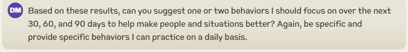 It also did a good job of recommending specific behaviors to work on - Active Listening and Patience, and Appreciation and Delegation.
